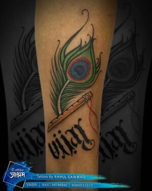 - Tattoo of god krishna’s Flute with peacock feather in color, This Tattoo was made and designed by Rahul Gaikwad at Tattoo Ashram, Vashi Navi Mumbai India.